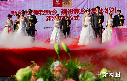 中新網(wǎng)新鄉(xiāng)11月22日 (記者 史寶銀 向明超)11月22日上午,由新鄉(xiāng)市文明辦、共青團新鄉(xiāng)市委、新鄉(xiāng)市婦女聯(lián)合共同主辦的“愛我新鄉(xiāng)、建設(shè)家鄉(xiāng)”集體婚禮在新鄉(xiāng)市人民公園東門廣場隆重舉行。慶典儀式上,新郎新娘紛紛捐出了自己的禮金,購買了5000枚石榴花圖案的新鄉(xiāng)市徽向市民免費發(fā)放,同時倡議市民熱愛家鄉(xiāng),建設(shè)家鄉(xiāng)。