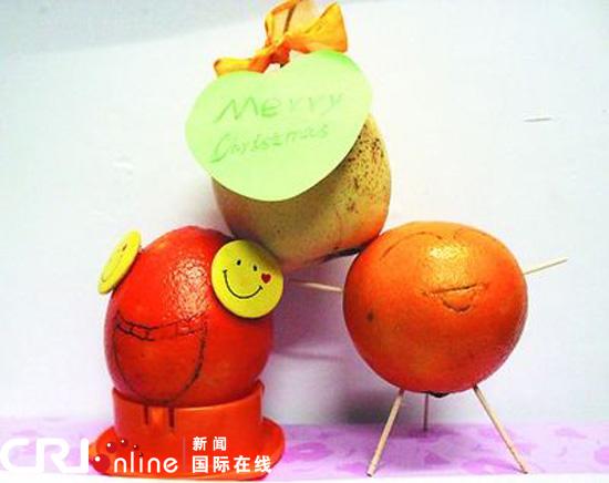 “因為圣誕節(jié)就要到了,所以今年這個水果賀卡比較有新意,在我們大學生之間也比較流行這種方式。比如我手里的這個橙子,它的意義就是真誠,還有蘋果的意思就是平安。當你把這個禮物送給別人的時候,他收到以后肯定很新奇,和收到紙質(zhì)賀卡不一樣的心情,減少浪費,比較適合現(xiàn)在過節(jié)的氣氛!毙櫿f。