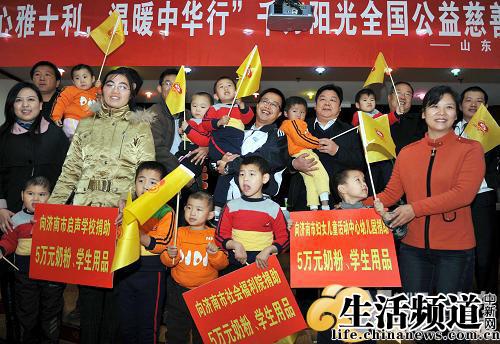雅士利集團(tuán)山東營業(yè)部經(jīng)理馬紅兵表示:雅士利一直以來,將公益活動當(dāng)作自己的使命,當(dāng)作一項(xiàng)偉大的事業(yè),盡心盡力地做好它。希冀以此來回報(bào)社會多年來對雅士利品牌的信任和厚愛!雅士利人從扶貧救災(zāi),到修橋造路;從文化體育,到醫(yī)療衛(wèi)生的公益道路上永不停步,多形式向社會捐款捐資超4000萬元。雅士利將通過這項(xiàng)千萬陽光工程,并和山東省慈善總會合作,捐贈價(jià)值50萬元的奶粉一批,對邊遠(yuǎn)地區(qū)弱勢群體,對兒童的健康和教育給予特別關(guān)愛,希望繼續(xù)將“愛心”與“溫暖”灑向齊魯大地。
