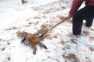 昨天清晨5點多,王阿姨在公園里又發(fā)現(xiàn)了一只被虐殺的流浪貓。王阿姨邊哭邊說,“前天傍晚我剛喂過它,沒想到今天就被人打死了!边@只被虐殺的流浪貓被王阿姨親切地叫做“小灰灰”,它兀自躺在公園東門附近的一處雪地上,腹部被殘忍地剖開,內(nèi)臟和肚腸依稀可見,毛上的血液早已凝固,但它的眼睛卻瞪得大大的。