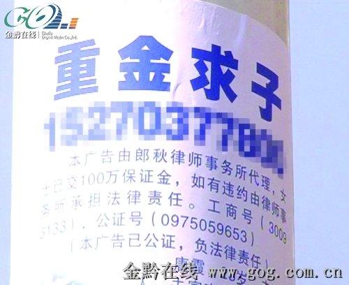 這幾天,在都勻市區(qū)主要街道的電桿上和小區(qū)廣告欄上,都有一張附帶相片的“重金求子”的廣告。公安人員在抓獲張貼者進(jìn)行審訊后,提醒廣大市民這種廣告除了電話號(hào)碼是真的外,其他的一切都是假的,謹(jǐn)防上當(dāng)。