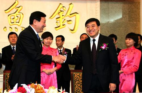 阜新市市長潘利國(前排左)和伊利集團董事長潘剛(前排右)出席并簽署協(xié)議。