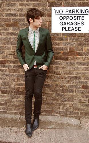 1.復(fù)古碎花襯衫 Vintage Shop 2.墨綠西服外套 topman 3.綠色絲帶 DIY 4.黑色瘦腿褲子 topman