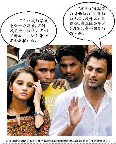 巴基斯坦板球明星舒艾卜·馬利克與印度知名網(wǎng)球運動員薩妮亞·米爾扎定于本月成婚,但婚禮前夕橫生枝節(jié)。印度警方5日沒收馬利克護照,禁止他離境,原因是另一名印度女子自稱已于2002年與馬利克結(jié)婚。