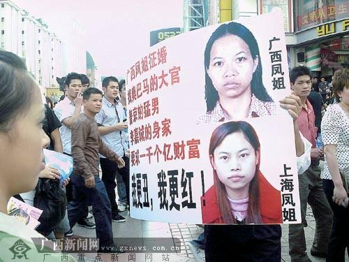 “找?jiàn)W巴馬的大官、普京的猛男、李嘉誠(chéng)的身價(jià)、要求一千個(gè)億財(cái)富……”4月11日下午,一男子在南寧市裕豐商廈門(mén)前,舉出“廣西鳳姐征婚”的廣告牌,聲稱(chēng)要為自己的一位親戚——“廣西版鳳姐”征婚。當(dāng)天在現(xiàn)場(chǎng),所謂的“廣西鳳姐”故作神秘沒(méi)現(xiàn)身,但其開(kāi)出的征婚條件卻“雷倒”了眾多圍觀市民。這也引起了一些好奇市民的猜想和質(zhì)疑:“廣西鳳姐”是不是想學(xué)新近的“網(wǎng)絡(luò)紅人”——羅玉鳳(“鳳姐”)來(lái)出名?