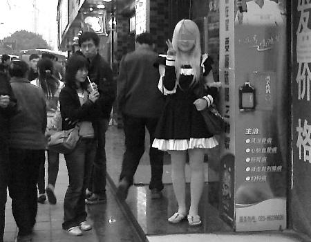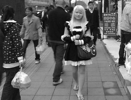 在人潮如織的大街上,一位身穿黑色女仆裝的金發(fā)女孩,正悠然自得地閑逛著——這仿佛日本動(dòng)畫片中的場景,前日下午,竟在大坪正街上演。原來,這位17歲的女孩,是一位地道的日系“動(dòng)漫族”,有時(shí)候是女巫裝,有時(shí)則是人型電腦裝,幾乎每天她都會(huì)按照日本動(dòng)漫角色的穿著出門。