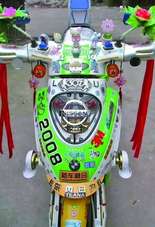 這輛電瓶車不得了,看車頭:寶馬、標(biāo)致、日產(chǎn)、東風(fēng)各種標(biāo)致全貼上了,還有可愛的helllo kitty 、snoopy等小掛飾,更加“致命”的是兩個(gè)反光鏡上還綁著兩朵大紅塑料花,就一輛電瓶車而言,可謂“風(fēng)騷”到了極點(diǎn)。