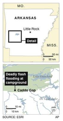 美國阿肯色州一個著名旅游度假區(qū)11日清晨遭遇猛烈洪水襲擊,至少有16名游客因被洪水卷走而喪生,還有40多人下落不明。事發(fā)前夜,當(dāng)?shù)剡B降傾盆暴雨,結(jié)果造成河水以每小時2米多的速度猛漲,沿河兩側(cè)的多個野外宿營地中的300多人因此在睡夢中不幸遭遇了滅頂之災(zāi)。