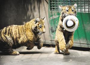 不過(guò),還是東北虎“見(jiàn)多識(shí)廣”,一看就知道足球是玩具,高興地甩起了前爪開(kāi)始踢球,“虎妞”、“虎寶”這對(duì)兄妹,為了搶奪這只足球真是使上了全身力氣,差點(diǎn)搞得兄妹反目。