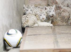 那邊南非世界杯已經(jīng)開(kāi)打,而這邊紅山動(dòng)物園的動(dòng)物們也蠢蠢欲動(dòng)。昨天,首屆動(dòng)物世界杯盛大舉行,小黑猩猩、小白虎、小獼猴個(gè)個(gè)“帶球上陣”。別當(dāng)真以為它們要踢球,其實(shí),這只是園方為動(dòng)物增加豐容項(xiàng)目,讓動(dòng)物在園里生活得更健康,正值世界杯之際,園方給一些適合玩足球的動(dòng)物放入了足球,供動(dòng)物玩耍。