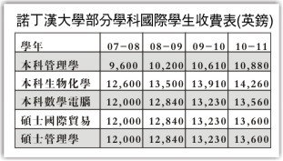 諾丁漢大學位于英國中部。由于近幾年與中國多所院校合作辦學,中國留學生成批涌進這所大學;同時該校還在浙江寧波設立分校,有條件的大三學生會到英國讀書一年。記者聯(lián)系到該校的碩士研究生陳兵同學,他詳細列出該校歷年來的收費標準。今年的學費比去年略有上漲,但增長率與往年持平。他覺得這個上調的價格是合理的,中國來的同學都能接受。