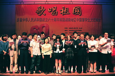 中新網9月28日電 據(jù)外交部網站報道,9月27日傍晚,來自光州市、全羅南道、全羅北道共11所大學的700名中國留學生在此歡聚一堂,參加由駐光州總領館和在韓中國留學生聯(lián)合會光州全南分會、全北分會聯(lián)合舉辦的“歌唱祖國——慶祝建國60周年韓國湖南地區(qū)中國留學生文藝晚會”。
