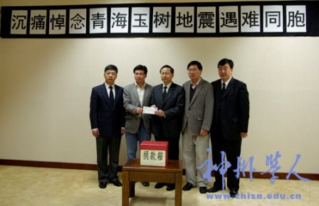2010年4月21日上午,在韓中國(guó)留學(xué)生會(huì)會(huì)長(zhǎng)李忠輝等代表全體留學(xué)學(xué)人向地震災(zāi)區(qū)捐款,駐韓中國(guó)大使館張?chǎng)紊笫菇邮芰肆魧W(xué)生的自愿愛(ài)心捐款。