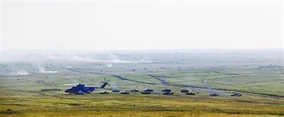 俄米-26直升機為中俄兩軍步兵戰(zhàn)車、坦克實施油料補給。本報記者 羅錚攝