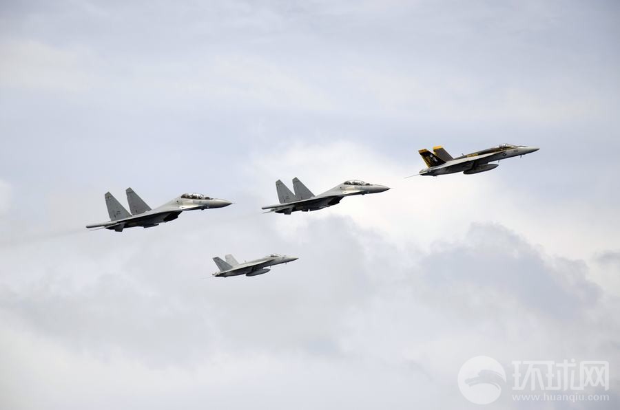 馬來西亞海軍的蘇-30戰(zhàn)機(jī)與美國海軍的F/A-18戰(zhàn)斗機(jī)組成編隊(duì)從華盛頓號(hào)航母上空飛過