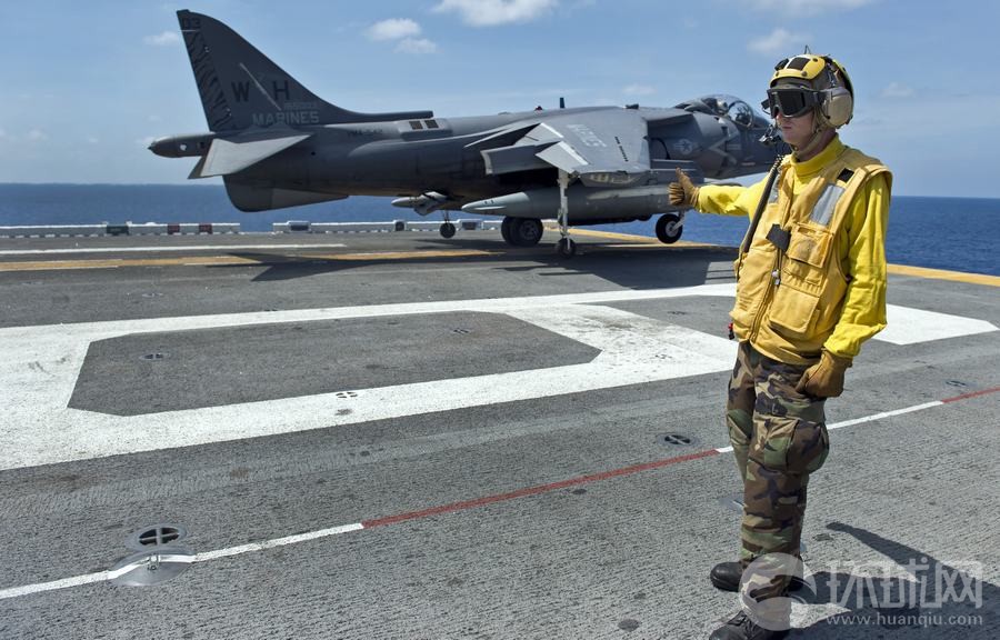 在此次美菲聯(lián)合登陸演習(xí)中,一架AV-8B鷂式戰(zhàn)斗機(jī)從好人理查德號(hào)兩棲攻擊艦上起飛。
