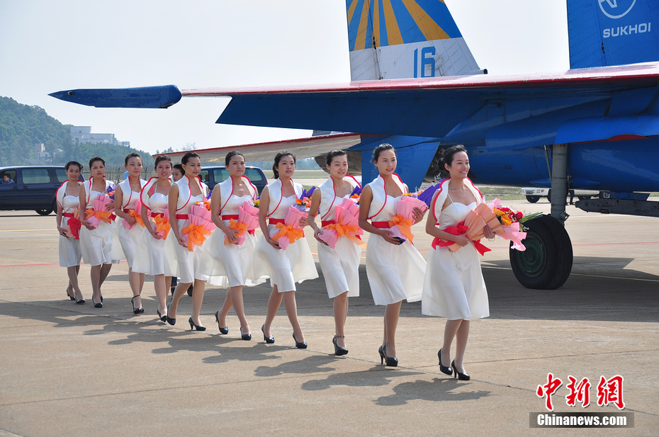 禮儀小姐準(zhǔn)備給俄羅斯的飛行員獻(xiàn)花。陳海峰 攝
