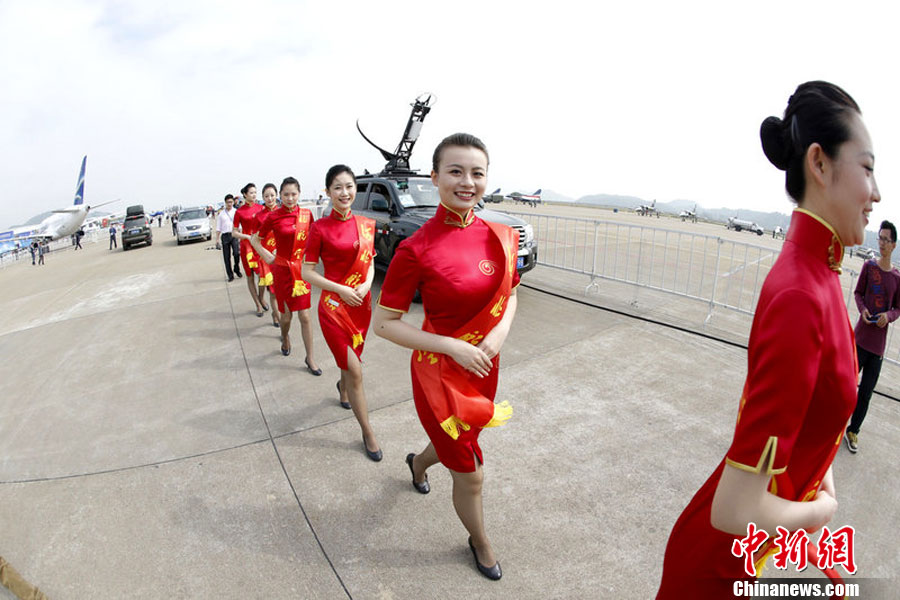 2012年11月12日,2012珠海航展開幕前夕,禮儀小姐身著旗袍亮相機(jī)場(chǎng),盡顯曲線美。圖片來源:東方IC 版權(quán)作品 請(qǐng)勿轉(zhuǎn)載