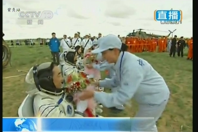 地面的工作人員向3名航天員獻(xiàn)花。(視頻截圖)