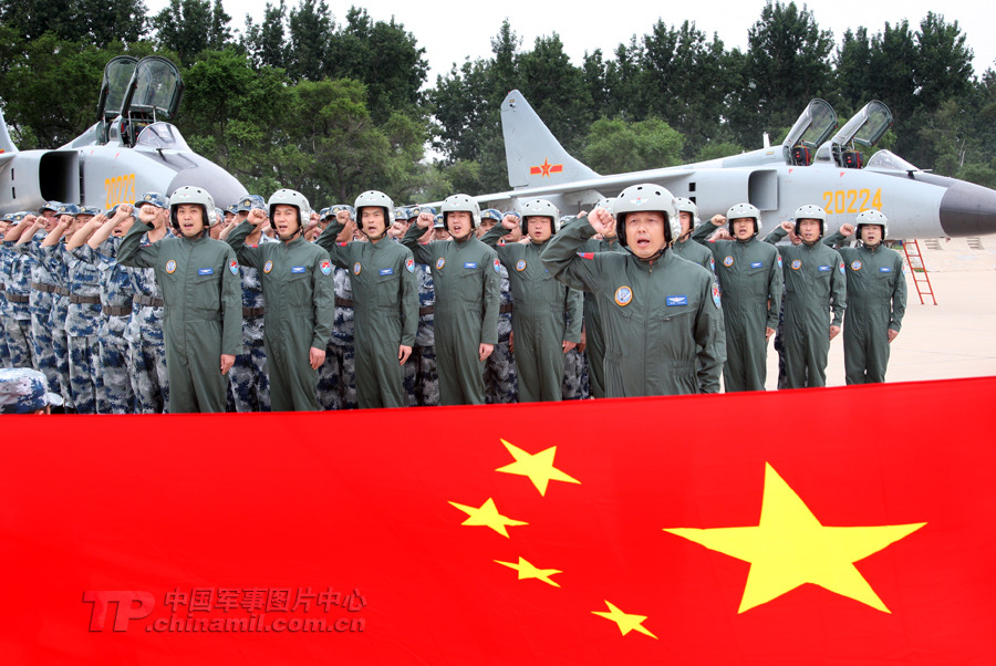 7月27日,參加中俄聯(lián)演的空軍戰(zhàn)斗群官兵出征前在國(guó)旗前集體宣誓,立志圓滿(mǎn)完成聯(lián)演任務(wù),為祖國(guó)爭(zhēng)光。 曹占禮 攝(來(lái)源:中國(guó)軍網(wǎng))