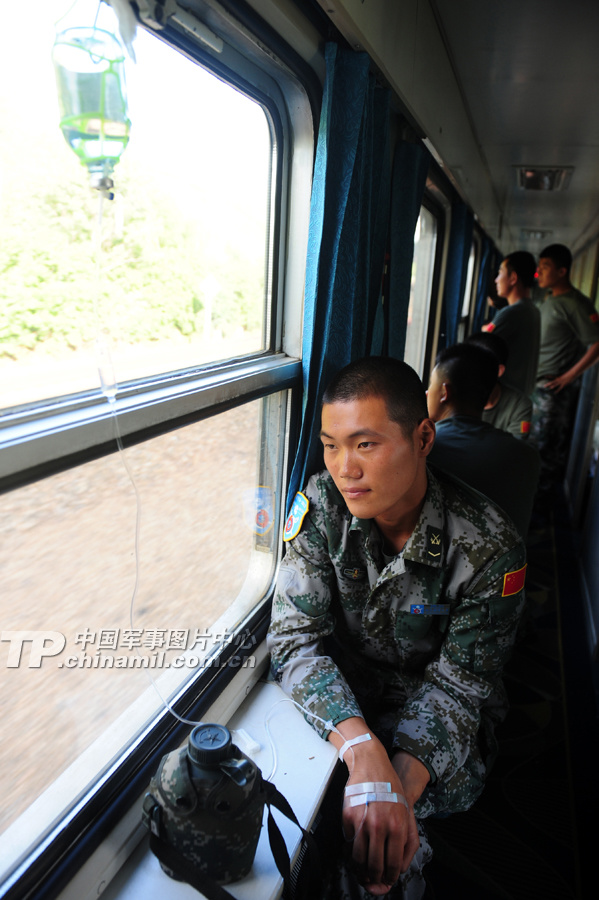 一名戰(zhàn)士在投送列車上打點滴,生病期間他沒落下一次訓(xùn)練。蓋旭輝 攝