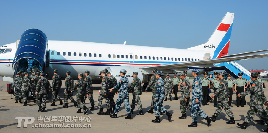 圖為中方導(dǎo)演部及指揮部人員乘專機(jī)全部出境,抵俄參演。中國(guó)軍網(wǎng)記者李靖攝