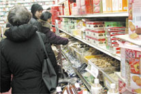 紐約東百老匯的中國城超市、香港超市也擠滿了買年貨的僑胞,其中以閩籍鄉(xiāng)親占多數(shù)。為吸引福州人,貨架上有多種從福建來的年貨。中國城超市一名員工說,年貨潮上個星期已經(jīng)開始了,福州鄉(xiāng)親好像怕遲買會賣光似的,都趕著一包兩包買回去,“中國人都要面子,過年不想失禮親朋的”。