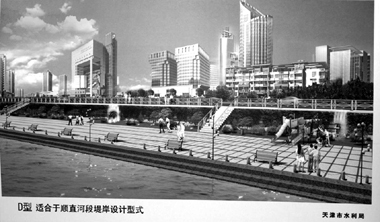為了達(dá)到良好的觀水效果,規(guī)劃海河兩岸原則上不設(shè)獨立防洪墻,根據(jù)不同地段的地形、地貌及開發(fā)建設(shè)要求,在不影響外觀及功能的前提下,采用建筑物底層外墻結(jié)合防洪要求,或在不影響交通的前提下,局部抬高路面或設(shè)置觀水平臺,并通過現(xiàn)代化防洪調(diào)度、分流等措施,確保城市防洪、排瀝安全。