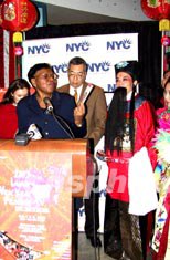 美國亞美商業(yè)發(fā)展中心邀請紐約市旅游局共同舉辦中國農歷羊年新春慶祝活動。一月十六日,主辦者在曼哈頓中城舉行記者會,亞美商業(yè)發(fā)展中心總裁王章華(中)介紹帝國大廈亮燈慶祝以及紐約華埠即將舉行的多項活動。曼哈頓區(qū)區(qū)長費絲(左)特意前來祝賀,她拿著剛剛出版的《華埠旅游指南》愛不釋手,希望慶;顒幽芡苿尤A埠和曼哈頓的經濟復蘇。作者:趙海燕