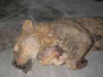 為了配合公安機關(guān)偵查,李滿堂將已經(jīng)包裹好的獅子尸體重新打開,從獅子的表情可以看出死時很痛苦,李滿堂說,大約在最近幾天,他便發(fā)現(xiàn)籠中的兩頭獅子有些不對勁,整日無精打采,不愛吃食。開始以為獅子患了感冒,給獅子吃了些消炎藥,但隨后兩天獅子仍然不見好而且厭食情況一天比一天嚴重,并開始出現(xiàn)嘔吐癥狀,隨后公園工作人員將嘔吐物送至丹東市動物檢疫站化驗。