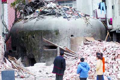 據(jù)人民網(wǎng)報(bào)道,漢口建設(shè)大道旁金惠公寓居民劉先生昨日憑欄遠(yuǎn)眺時(shí),突然發(fā)現(xiàn)建設(shè)大道拓寬工程拆遷處露出一座三四米高,如天文臺(tái)頂一般的圓頂龐然大物,仔細(xì)觀察,竟是一座碉堡。