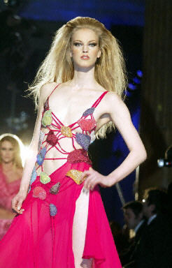 1月26日,羅馬時裝周上模特展示了2004春夏時裝最新流行趨勢。圖為模特展示意大利設(shè)計(jì)師Gai Mattiolo 的作品。