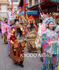 據(jù)日本共同社報道,扮演楊貴妃和三國時代人物的市民們身著各色衣裝走在街上,這是將從農(nóng)歷除夕31日開始的“南京町春節(jié)慶典”的預演。在鼓聲和銅鑼聲中,中國明朝的皇帝迎面走來,隨后是劉備、呂布、關(guān)羽等三國英雄,表演使得觀光游客大飽眼福。