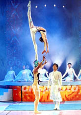 中國新秀魏葆華和吳正丹在北京春節(jié)晚會(huì)上表演雜技《梁祝·化蝶》,此節(jié)目曾經(jīng)獲得第二十六屆蒙特卡羅金小丑芭蕾舞金獎(jiǎng)。作者:王新