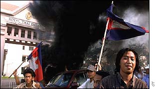 據(jù)BBC報(bào)道,縱火燒毀了泰國(guó)大使館后,約一千名示威者又攻擊了其他建筑。