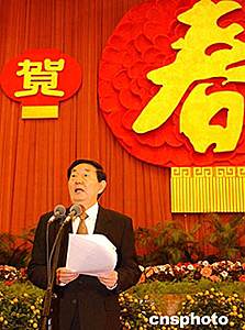 中共中央、國務(wù)院今天上午在人民大會堂舉行春節(jié)團(tuán)拜會。江澤民、胡錦濤等多位領(lǐng)導(dǎo)人同北京各界人士四千五百多人歡聚一堂,辭舊迎新,共慶中國人民的傳統(tǒng)節(jié)日。朱镕基在團(tuán)拜會上講話。
