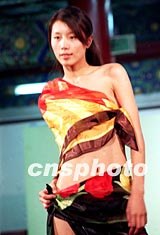 北京模特在春節(jié)文化廟會(huì)上表演主題為《江南情思》的系列時(shí)裝,以精簡(jiǎn)的裝飾展示美好身材。作者:鄒憲