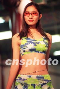 圖:身著泳裝的模特在北京廟會(huì)T型舞臺(tái)上