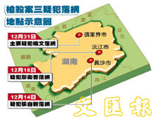 中新網(wǎng)2月5日電元月31日凌晨,經(jīng)湖南省公安廳和張家界市警方周密布控,公安部督捕、震驚粵港湘三地的香港陸羽茶室“11·30”槍殺富豪林漢烈案主要嫌兇楊文在張家界市落網(wǎng)。至此三名嫌兇全部落網(wǎng)。香港文匯報(bào)今天刊載了槍殺案三疑犯落網(wǎng)地點(diǎn)示意圖。