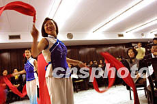 春節(jié)期間,美國芝加哥華人華僑相聚一堂,他們跳起紅綢舞,過個(gè)喜氣洋洋的中國節(jié)。作者:王瑤
