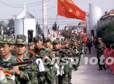 解放軍軍事經(jīng)濟(jì)學(xué)院的學(xué)員隊(duì)伍新春展開行軍演練,途中在湖北省谷城縣受到百姓官員夾道歡迎。作者:王偉兵