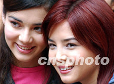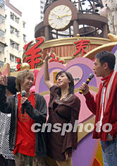 香港歌手李蘢怡、和“明珠大使”保采芬,二月九日出席在銅鑼灣時(shí)代廣場(chǎng)舉行的情人節(jié)“戀人短訊”大募集活動(dòng)。錢(qián)興強(qiáng) 攝