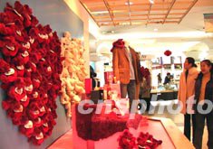 情人節(jié)將近,北京中友商廈將上百只毛絨小熊組成紅白兩顆愛心吸引顧客。作者:廖文靜