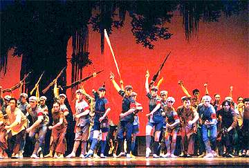 自從1964年公演以來,芭蕾舞劇《紅色娘子軍》廣受各界人士推崇。當年老一輩藝術(shù)工作者在創(chuàng)作該劇時,曾到娘子軍的故鄉(xiāng)海南島深入生活。劇中射擊、投彈、刺殺的舞蹈是軍隊動作與芭蕾舞足尖技巧的結(jié)合,生動地塑造出了女戰(zhàn)士們的颯爽英姿。此外,像“五寸刀舞”、“軍民聯(lián)歡舞”、“黎族少女舞”、“大刀舞”、“紅軍過場”等舞段給觀眾留下了深刻的印象。