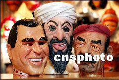 在美國(guó)和伊拉克以及本·拉登之間的爭(zhēng)端愈演愈烈的同時(shí),仿造美國(guó)總統(tǒng)布什、恐怖大亨本·拉登和伊拉克總統(tǒng)薩達(dá)姆的形象的面具在美國(guó)及一些國(guó)家正逐漸成為熱銷(xiāo)產(chǎn)品。Ic/cnsphoto 攝