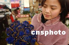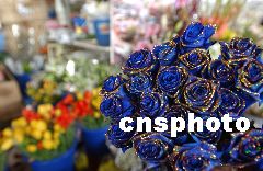 1月13日,鄭州陳寨花卉市場,金邊藍(lán)色玫瑰(藍(lán)色妖姬)售出天價,每枝賣出380元的高價,由于商家進貨不多,而且只有一、兩家經(jīng)銷商有貨,據(jù)經(jīng)營者介紹,銷售還不錯。馬健 攝