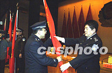十四日,北京警方舉行治安系統(tǒng)“兩會(huì)”安全保衛(wèi)動(dòng)員大會(huì),公安局長馬振川(右)為“兩會(huì)”治安保衛(wèi)突擊隊(duì)授旗。作者:任海霞