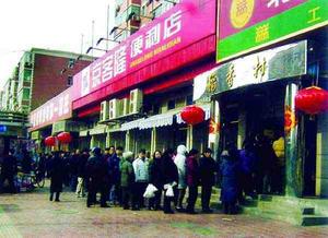 中午1點(diǎn)10分,記者在勁松橋西北角的稻香村分店門口看到,排隊(duì)的顧客有180多人,隊(duì)伍一直向西遮擋了該店隔壁兩家店鋪的街面,蜿蜒到了一棟宿舍樓前。排在最后的顧客已經(jīng)開始聊天解悶。商店門口的柱子上則貼著“每人限購4斤”的告示,兩名男營業(yè)員站在柜臺(tái)外維持秩序,正在買元宵的顧客說,自己9點(diǎn)多就排上了,都快沒信心了才輪到。