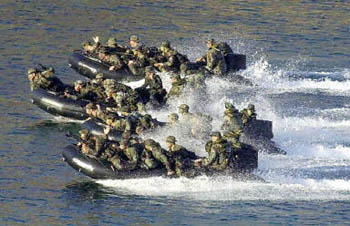為鏟除阿布沙耶夫恐怖組織,美海軍陸戰(zhàn)隊18日在馬尼拉以南島嶼與菲律賓軍隊舉行聯(lián)合軍事演習(xí)。圖為:美海軍陸戰(zhàn)隊西棲搶灘登陸。