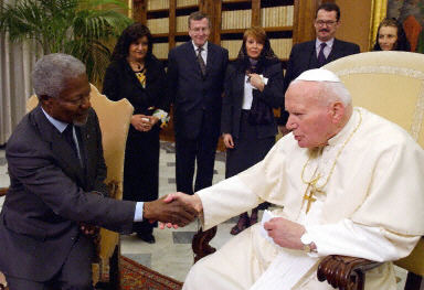 聯(lián)合國(guó)秘書(shū)長(zhǎng)安南18日與羅馬天主教皇約翰保羅二世在梵蒂岡舉行了會(huì)談。